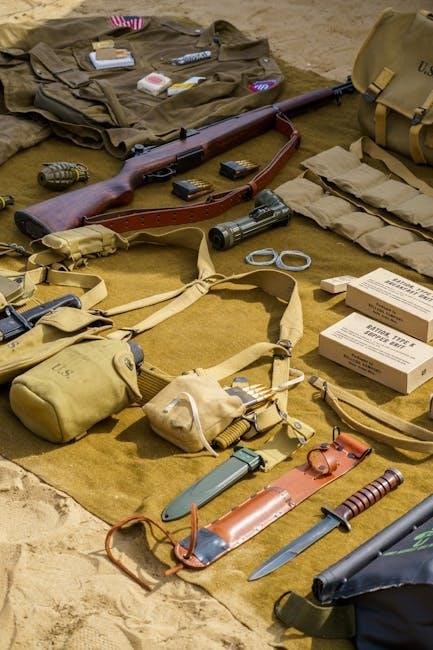 The Manual of Arms outlines standardized procedures for handling the M1 Garand, emphasizing discipline and safety․ It covers positions like Attention, Port Arms, and Shoulder Arms․ Soldiers are trained to perform these movements precisely to maintain control and prevent accidents․ Proper techniques for presenting arms, right and left shoulder arms, and about-face are detailed․ These procedures ensure uniformity and safety during drills, ceremonies, and field operations․ Mastery of the Manual of Arms is essential for military bearing and operational readiness, reflecting the rifle’s historical role in training and discipline․ Consistent practice reinforces muscle memory, enabling smooth and efficient handling under any condition․